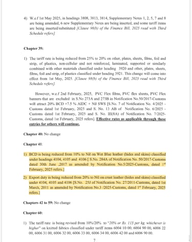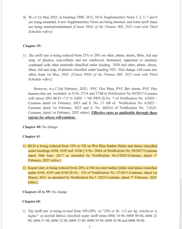 Basic Customs Duty (BCD) on Wet Blue Leather has been reduced from 10% to 0%, effective February 2, 2025