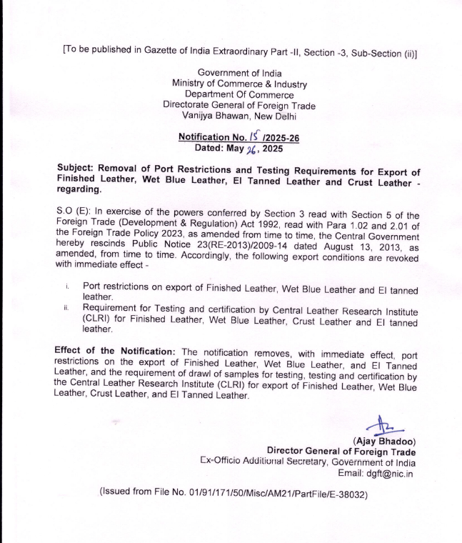 In a landmark decision, the Directorate General of Foreign Trade (DGFT) has issued Notification No. 15/2025-26 dated May 26, 2025, revoking several key restrictions on the export of finished leather products. This move is expected to provide a major boost to Indian leather exporters, enhancing global competitiveness and ease of doing business.
