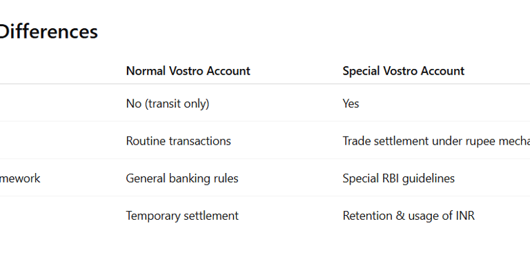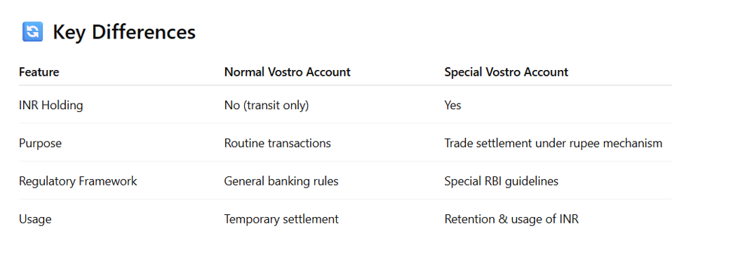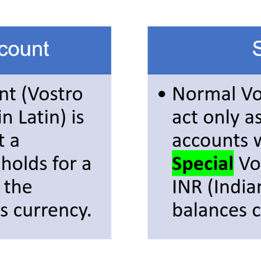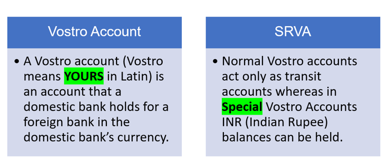 SRVA (Special Rupee Vostro Account): This is a particular type of Vostro account used to settle international trade in Indian Rupees, rather than global reserve currencies like USD.